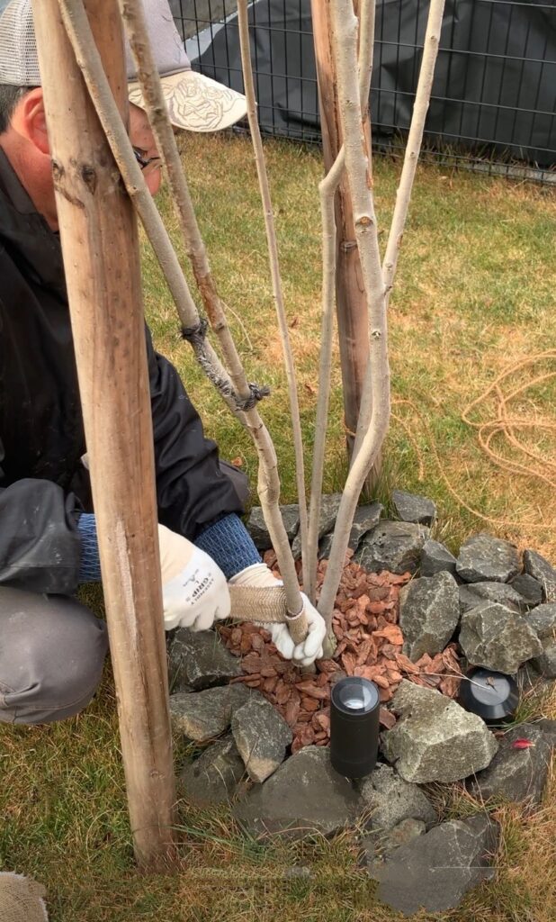 樹木の根元に腐葉土を被せることで根の凍結を防ぎ、幹には緑化テープを巻きつけることで冬の寒さから守ります。