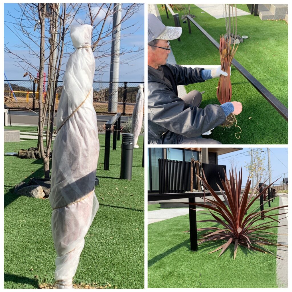不織布を纏って寒さに備えます。冬の庭の風物詩になりそうですね。