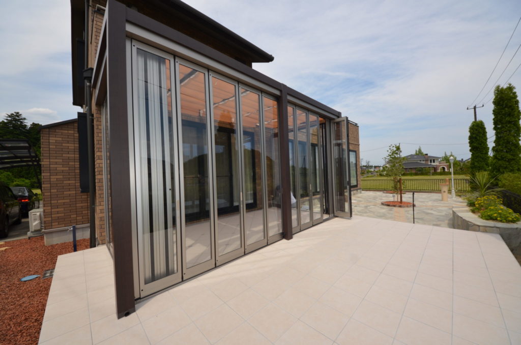 リビングとお庭を繫ぐガーデンルームのLIXILの『ZIMA』。正面と両サイドのガラス扉が全開放できますので、お庭の様でリビング、リビングの様でお庭と、シーンによって使い分けられる優れモノです。