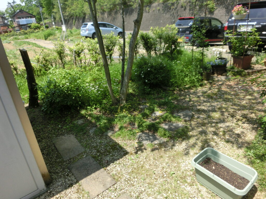 西側には広大な畑。接する道路は人や車のみならず勢いよく風も吹き抜ける開放的な立地。暴風林としての役割を期待し植えられた生垣は思うように成長せず、庭の管理も容易ではなかったことから、『ローメンテナンスで明るい庭にしたい』とのご依頼を頂きました。