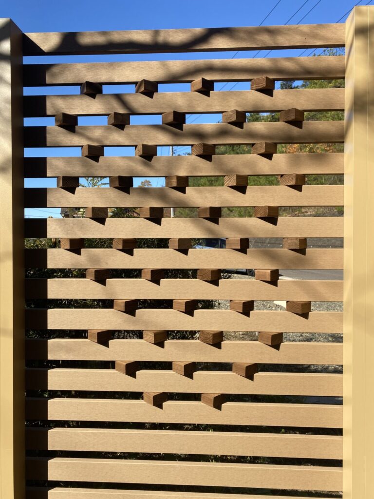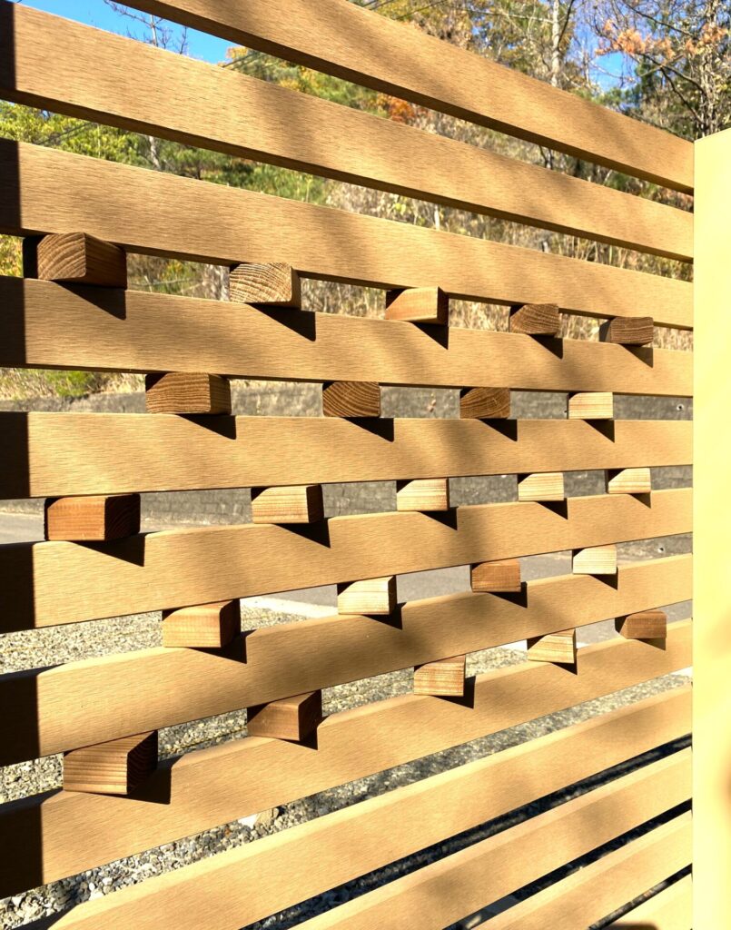 板材60㎜の隙間30㎜仕様のフェンスをベースに55㎜×30㎜の木製キューブを自由に配置。キューブを45度に取り付けることで陰影が美しく浮かび上がり和の趣を感じさせます。