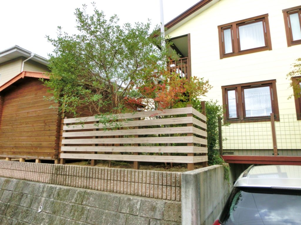 新調されたウッドフェンスは腐食の心配のないオールアルミ製。クラシックなホワイトパイン色の板とブラウンの柱との組み合わせです。こちらのフェンスも外構や庭の空気感の中で主張することなく馴染ませています。