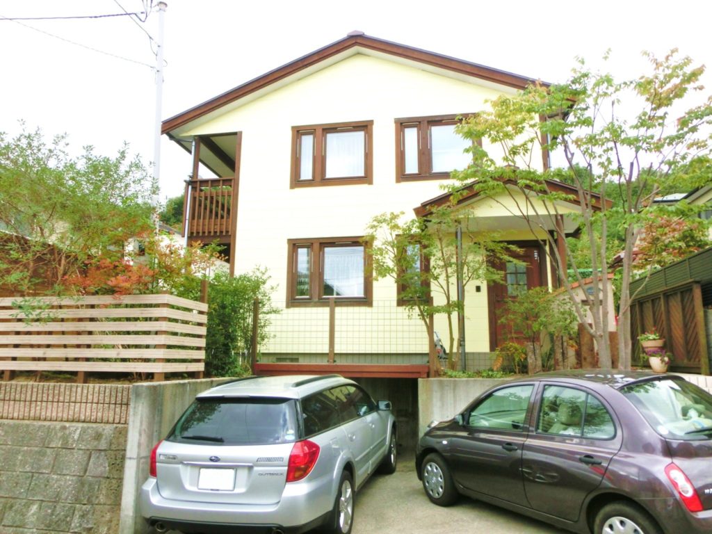 駐車場の天井を一部カルバート構造の様にウッドデッキで覆っています。自転車を収納するスペースとなりますが、車のボンネット部も収納できます。